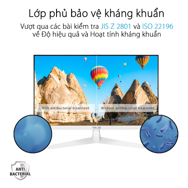 Các viền và phím nóng trên ASUS VY249HE-W có xử lý ion bạc kháng khuẩn bằng cách ngăn vi khuẩn bám dính. Nó giữ cho các khu vực quan trọng của màn hình luôn sạch sẽ và vệ sinh, có khả năng giảm sự lây lan của vi khuẩn có hại.